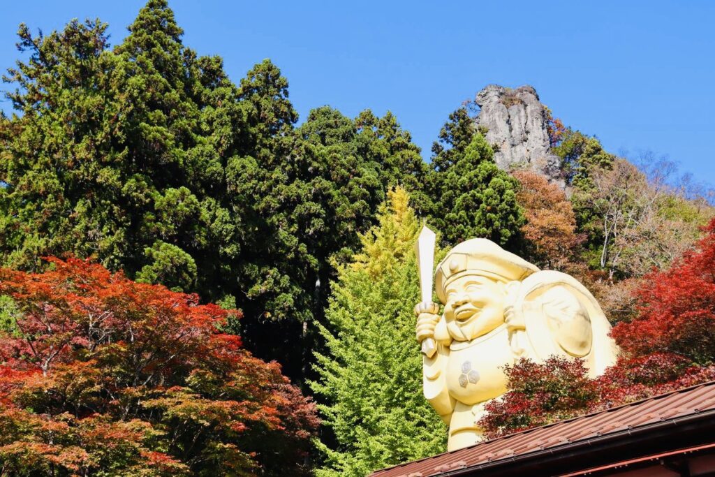 妙義山と日本一のだいこく様高さ二十メートル・重量八、五トン だいこく様のお姿は小槌を持っているのが一般的ですが当神社のだいこく様は剣を持つめずらしい姿で、病や厄、悪性を祓い福を招くと伝えられています。